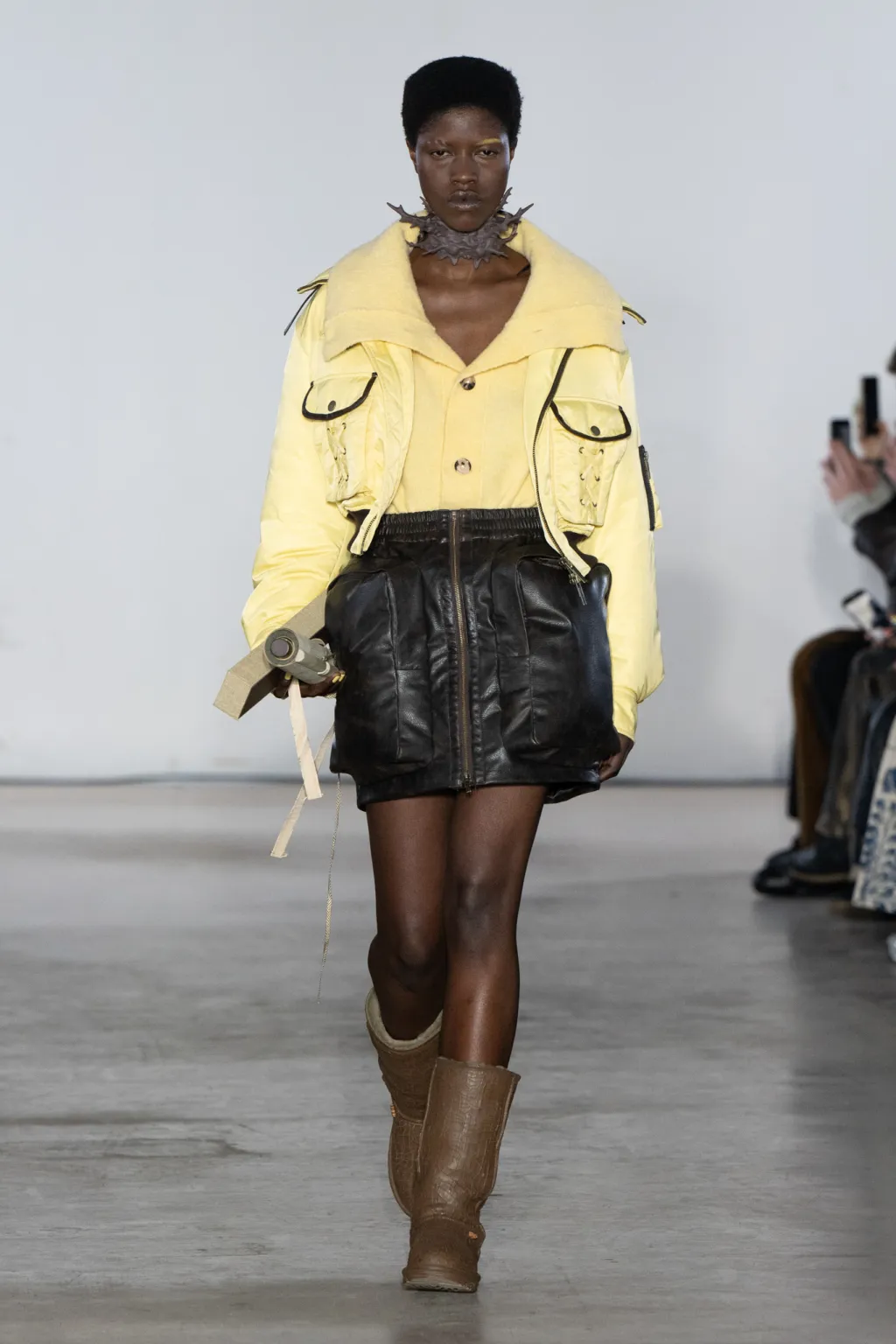Feng’s FW25 collection exuded a bold streetwear aesthetic, defined by oversized silhouettes and sculptural footwear. Monochrome ensembles in pastel yellow, earthy brown, rich blue, and head-to-toe denim commanded attention on the runway. Classic staples like suits, bomber jackets, trench coats, and turtlenecks were reimagined with such originality that they felt entirely reinvented. Feng also showcased a range of fabrics often considered the cornerstones of menswear, leather, denim, and wool, but elevated them with creativity and styling. These ‘big three’ were transformed into something uniquely her own, reflecting her ability to turn the familiar into the extraordinary.